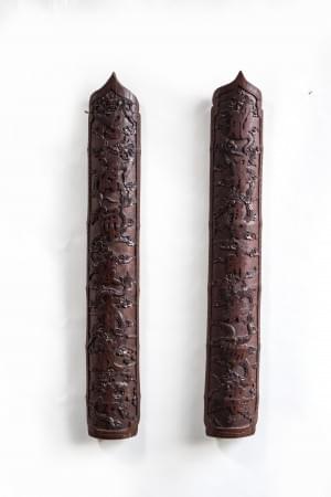 A décor sculpté et ajourées de scènes animées dans des arbres et...