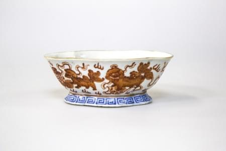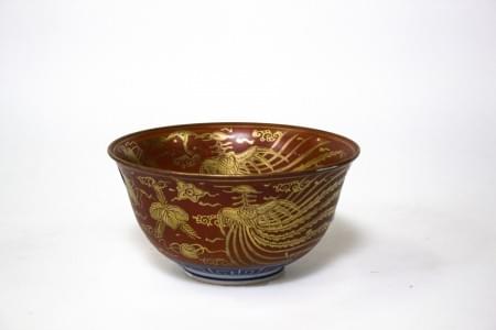 Porcelaine à décor or sur fond rouge d'un phénix, D 16,5 cm