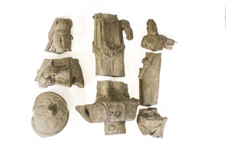 Debout sur une fleur de lotus, grès sculpté, brisé en plusieurs...