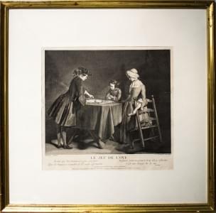 Les tours de cartes et le jeu de l’oye, deux gravures par Surugu...