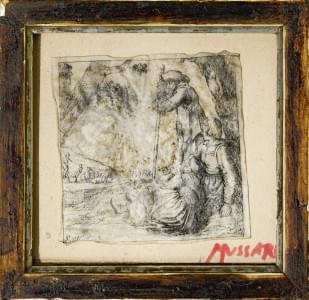Bergers, plume sur parchemin, monogrammée et datée 1744, 8x8 cm
