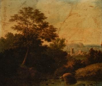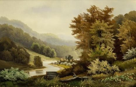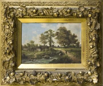 Paysage animé avec une rivière, huile sur toile signée, 39x60 cm