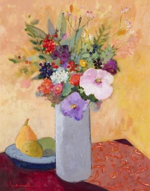 Bouquet de fleurs et fruits, huile sur toile signée, 50x40 cm
