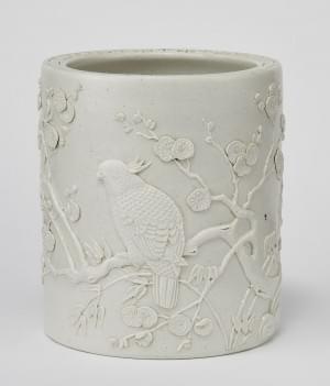 Porcelaine émaillée blanc à décor en relief d'un perroquet sur d...