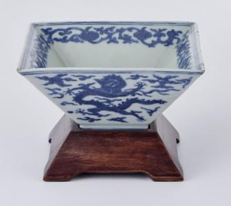 Porcelaine émaillée bleu blanc à décor de dragons, 15x15 cm