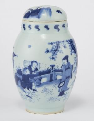 Porcelaine émaillée bleu blanc à décor de personnages, D 17,5 cm