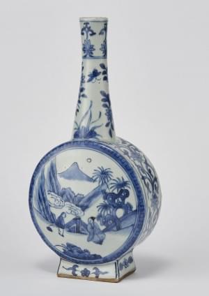 Porcelaine émaillée bleu blanc à décor d'un dignitaire et de per...
