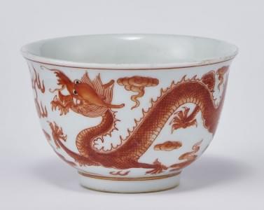 Porcelaine émaillée rouge de fer à décor de dragons, H 6 cm, D 9...