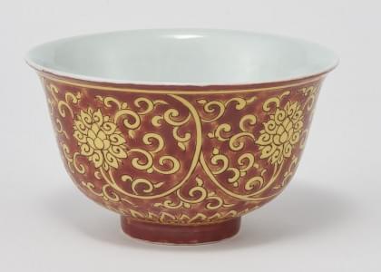 Porcelaine émaillée jaune et rouge, D 13 cm