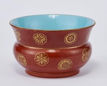Porcelaine émaillée corail à décor de médaillons or, intérieur t...