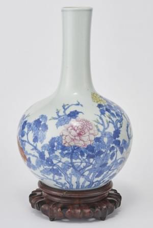 Porcelaine émaillée bleu blanc à décor de fleurs et roches, H 23...