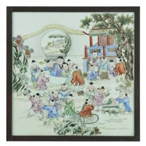 Porcelaine émaillée polychrome à décor d'enfants, 40x40 cm