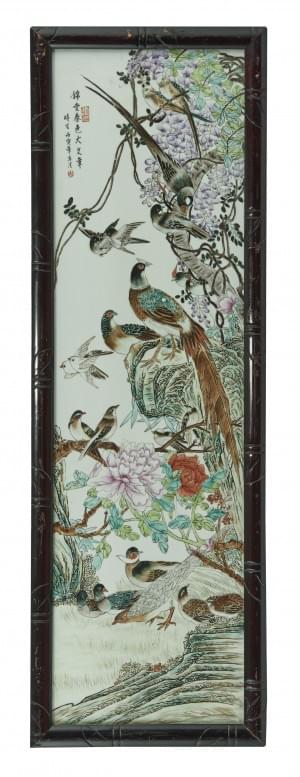 Porcelaine émaillée à décor de glycines et pivoines, 75x21 cm