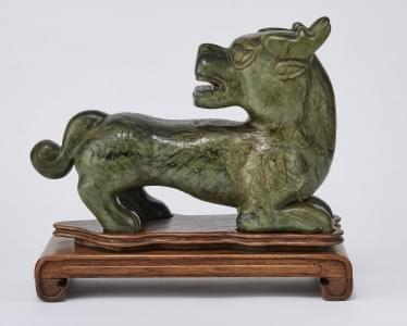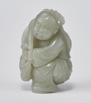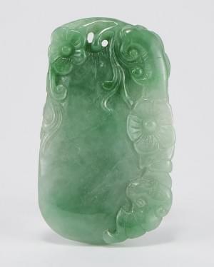 Jade à décor sculpté en léger relief de dragon poursuivant la pe...