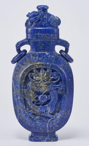 Lapis lazuli à décor d'un dragon et d'une guanyin en bas-relief,...