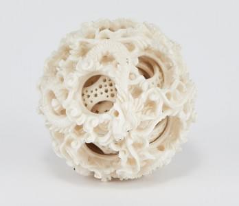 Ivoire sculpté, gravé et incrusté de nacre, signé, L 10 cm