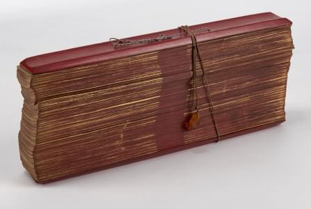 Encre sur feuilles de palmier et bois laqué rouge, 50x20x5 cm
