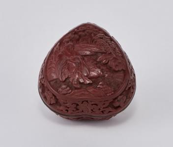 Laque rouge cinnabar en forme de pêche à décor de personnages, L...
