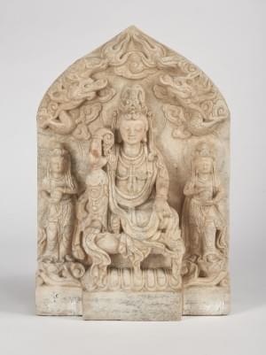 Marbre sculpté en bas relief à décor de Bouddha et de ses acolyt...