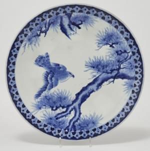Porcelaine émaillée bleu blanc à décor de faucons, D 46 cm