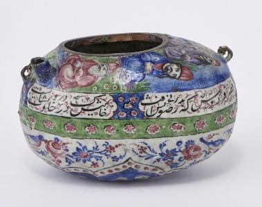 Cuivre et émaux polychromes à décor de calligraphie et personnag...