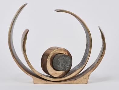 Trois cercles, bronze et pierre volcanique, signé, H 26 cm