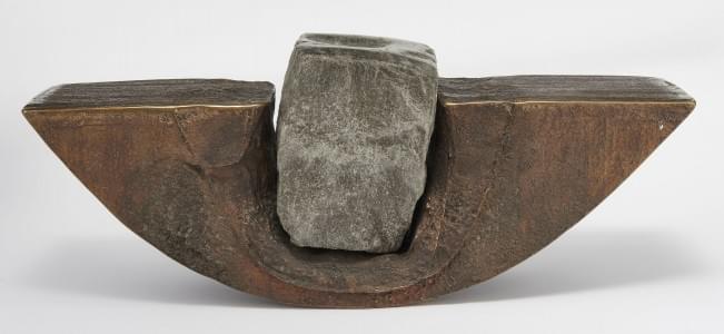 Composition, bronze et pierre volcanique, signée et datée 89, 15...