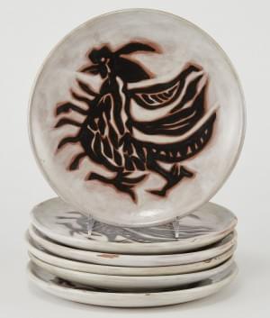 Six assiettes, céramique émaillée polychrome à décor d'un oiseau...