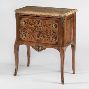 Deux tiroirs, bois de placage marqueté de rinceaux, bronze doré...