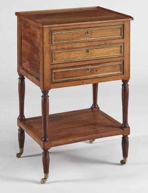 Deux tiroirs, pieds sur roulettes, acajou blond et laiton, 55x48...