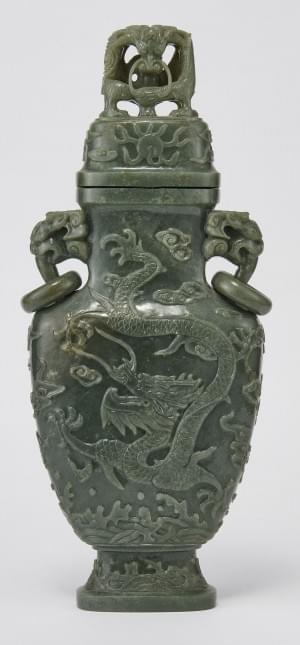 Jade à décor sculpté en léger relief de dragon poursuivant la pe...