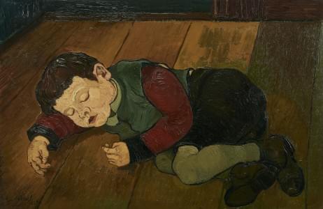 Enfant endormi, huile sur toile, 42x65 cm. Etiquette de la Münch...