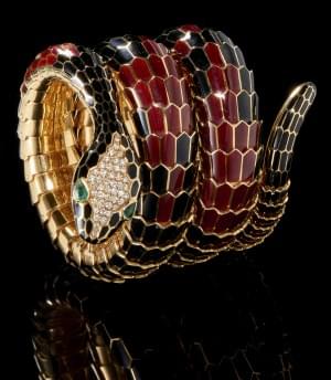 1018. Bracelet serpent émaillé noir et bordeaux, la tête pavée de diam...