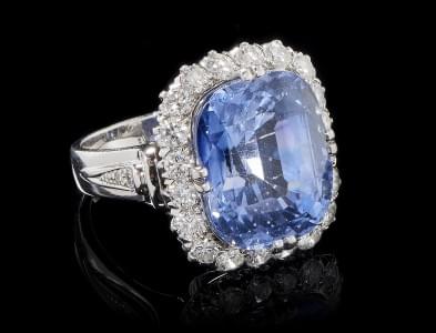 1054. Bague sertie d'un saphir taille coussin ovale (env. 14 ct) entou...