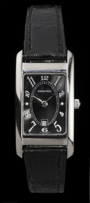 Cadran gris, aiguilles et index bâtons noirs, or gris 750, 17x15...