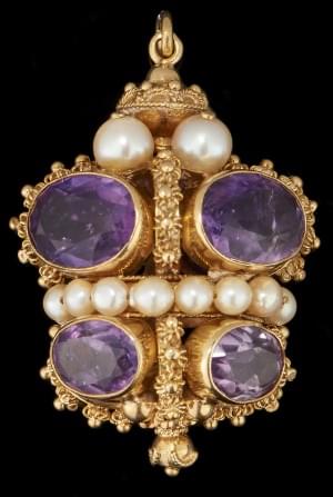 963. Broche sertie d'une améthyste taille brillant (env. 30 ct) entou...