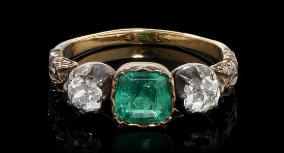 967. Bague ancienne sertie d'une émeraude (0.9 ct) épaulée de deux di...