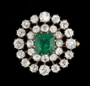 974. Broche sertie d'une émeraude carrée (env. 3,5 ct) dans un double...