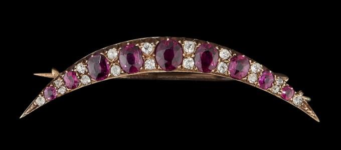 976. Broche croissant de Lune sertie de rubis (env. 1.8 ct) et de dia...