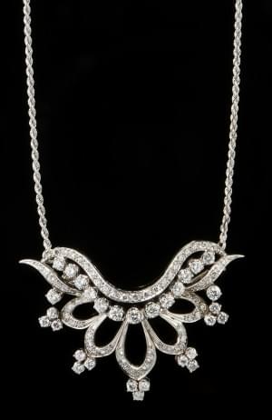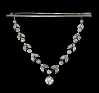 983. Broche barrette retenant un motif de guirlande serti de diamants...