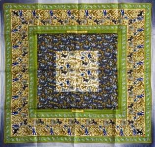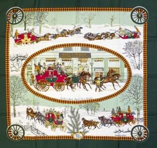 3032. Hermès, foulard "L'Hiver en Poste" à fond vert et bordure orange