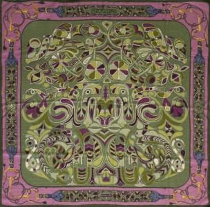 3009. Hermès, "Folklore", châle à fond violet et vert