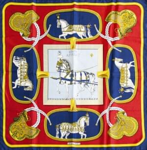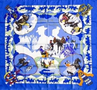 3010. Hermès, "Grand Apparat", foulard à décor de chevaux sur fond ble...