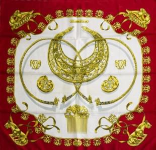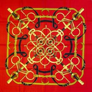 3021. Hermès, "Eperon d'or", foulard à décor doré et noir sur fond rou...
