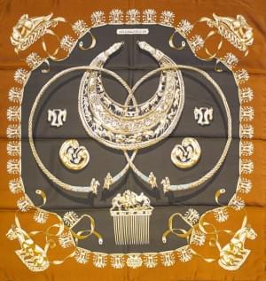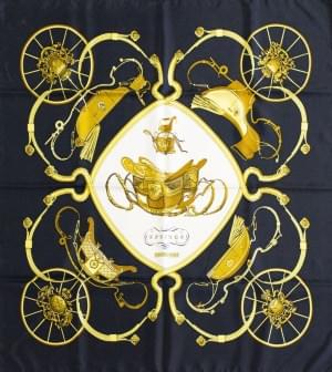 3020. Hermès, "Springs", foulard à décor d'attelage doré sur fond noir...