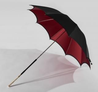 Tissu noir, intérieur rouge, manche en os sculpté surmonté d'une...
