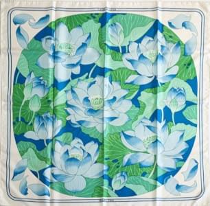 3019. Hermès, "Fleur de lotus", foulard à décor bleu et vert sur fond...