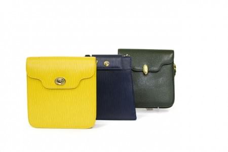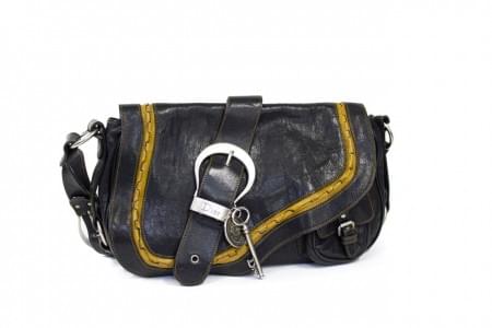 Cuir strié jaune, bleu foncé et cuir grainé vert, bandoulière en...