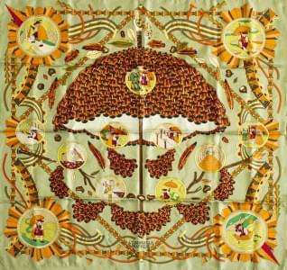 3030. Hermès, foulard "L'Ombrelle Magique" à fond vert et orange