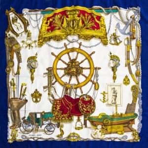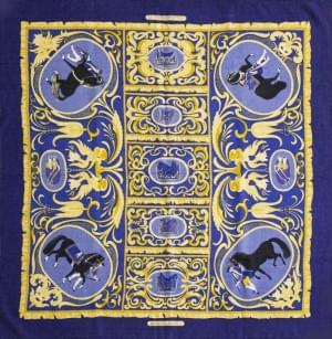 3034. Hermès, foulard "Musée" à fond bleu foncé et blanc